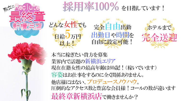 安心・安定の新横浜エリアで、本当に稼ぎたい女性を募集しています。 20代、30代だけでなく40代〜60代の女性も多数活躍中です! 豊富な待遇で、長く勤められる環境です。 ▶︎完全自由出勤! 未経験者、経験者、主婦、学生さん大歓迎!貴方のスタイルに合わせて安心して働けます。 ▶︎未経験でも安心! 風俗・デリヘル未経験の方もしっかり稼げる環境です。まずは新横浜の風俗・人妻デリヘル【熟女の風俗最終章 新横浜店】がどんなお店なのかを知ってください! ▶︎徹底した衛生管理 徹底した衛生管理で、性病予防万全でお仕事に集中できます。 ▶︎高収入・高待遇 お給料面はもちろん、女性が安心・快適に働ける環境が最終章にはあります!